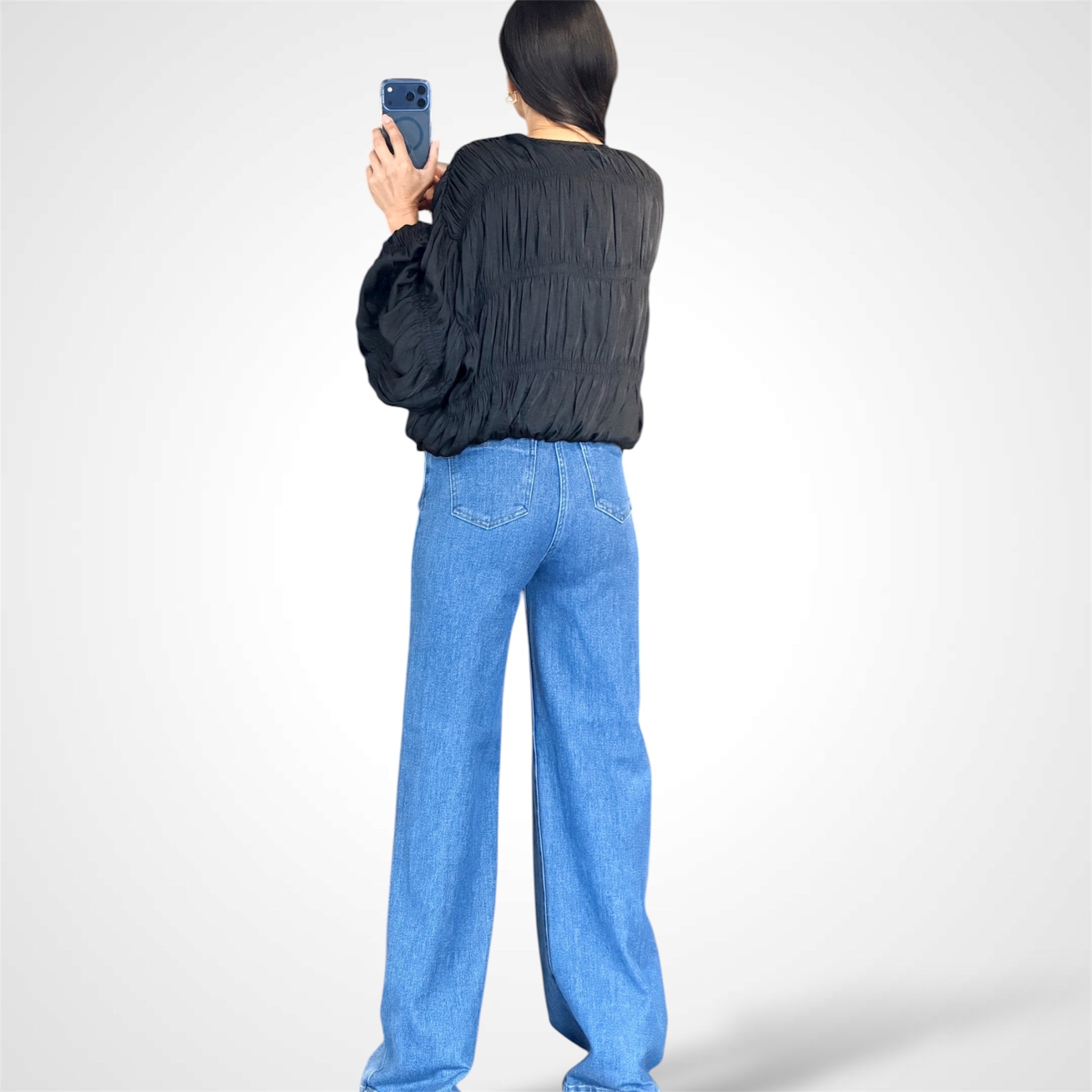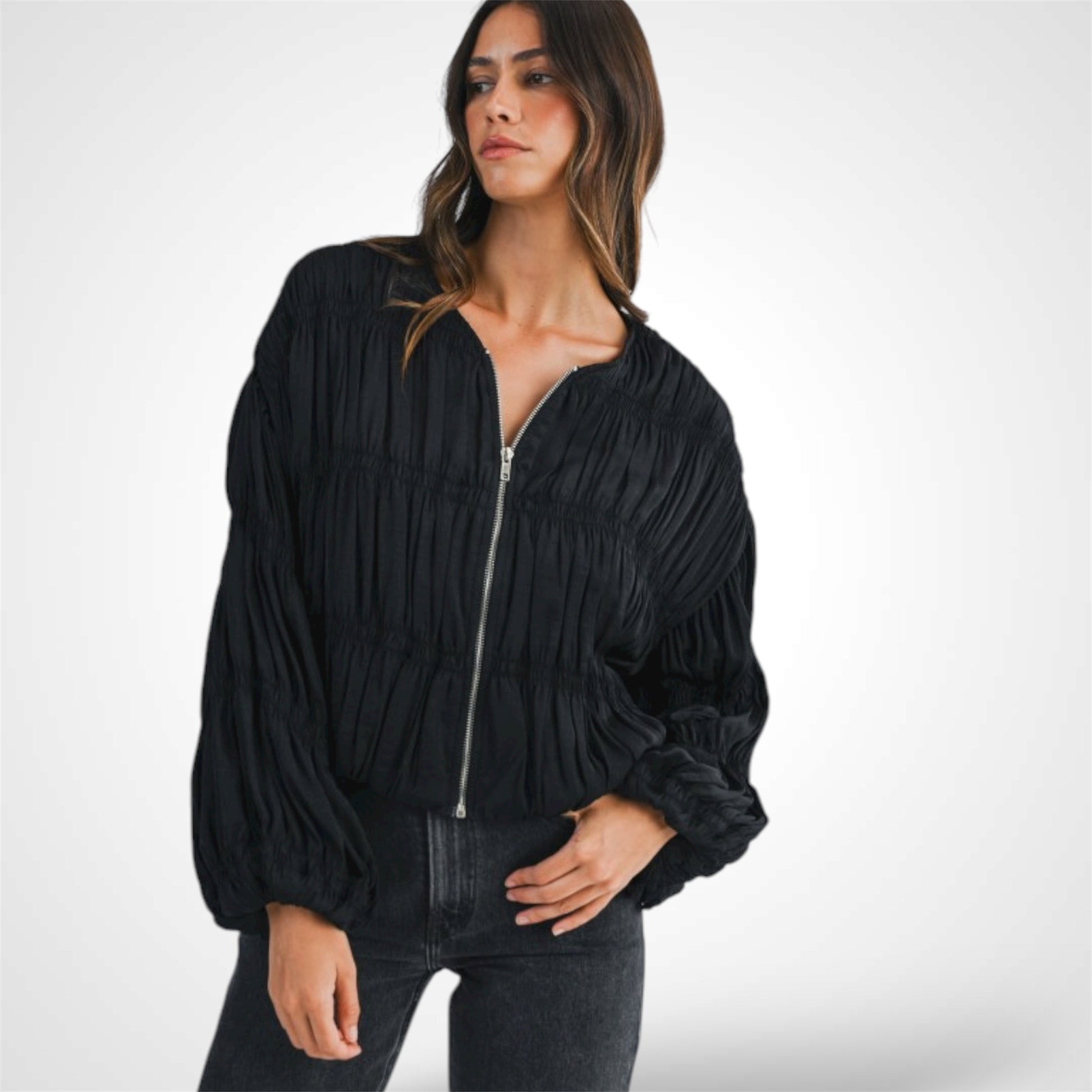 BLACK GATHERED SMOCKED OVER FIT JACKET