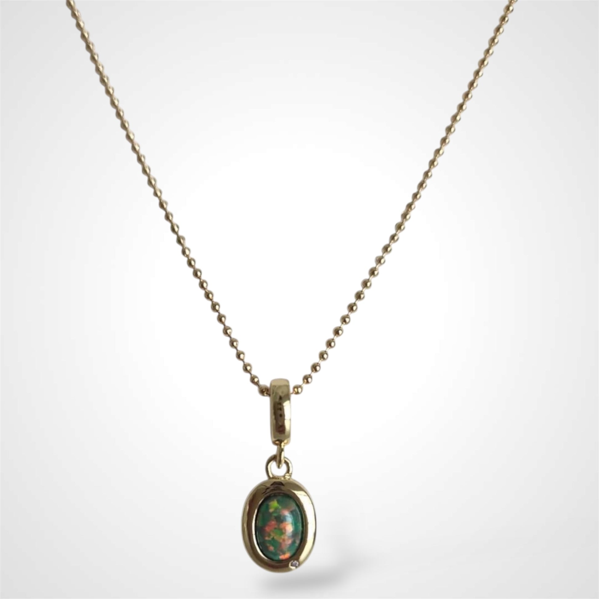 Elevate your ensemble with DELTA, a refined 16-inch hypoallergenic necklace crafted from premium 18k gold-filled chain. The centerpiece—a mesmerizing opal charm—captures light with its vibrant spectrum of colors, creating a subtle yet distinctive statement. Perfect for sensitive skin and designed for everyday luxury that transitions effortlessly from day to evening affairs.