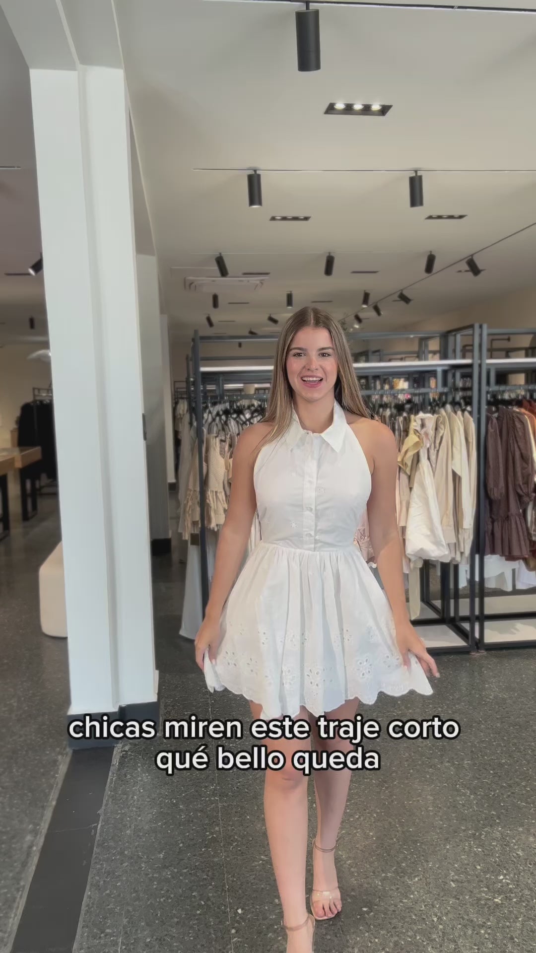 Eyelet lace sleeveless halter button down collared shirt style open back mini dress with back self tie detail. Lining