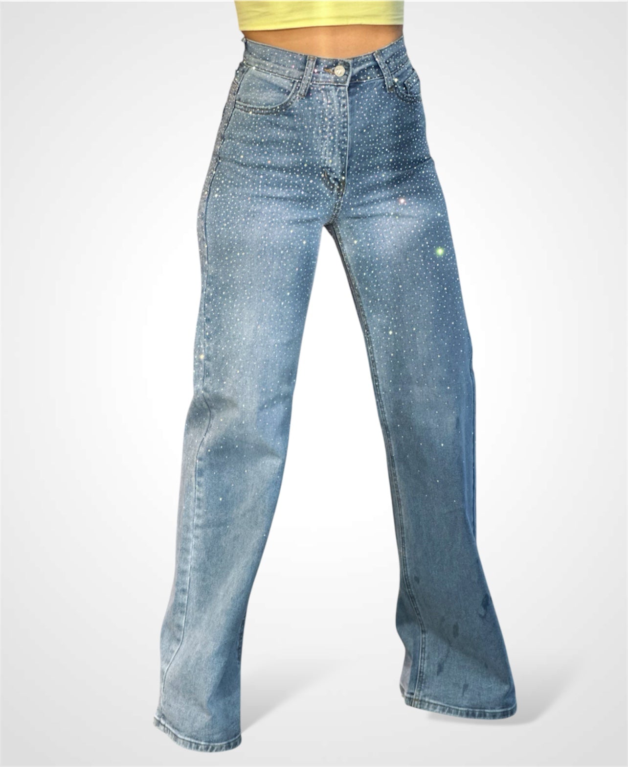 IRIDESCENT RHINESTONE HIGH-RISE WIDE LEG JEANS